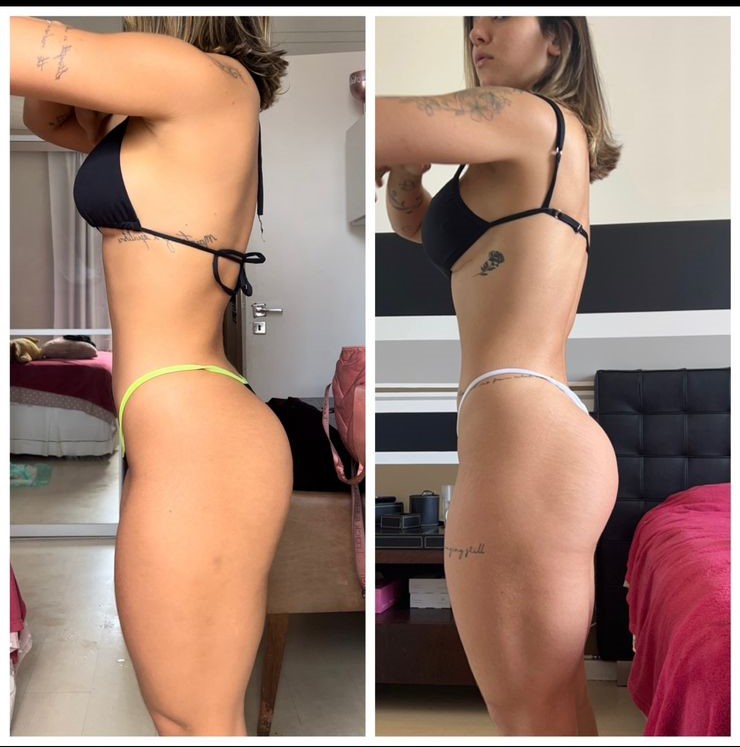 "AAAAAH to chocada com esse antes e depois, como meu corpo está tomando formas agora! A minha alimentação sempre foi certinha, mas ficava perdida na execução dos exercícios. Vocês vieram e salvaram minha vida hahaha só tenho a agradecer por isso. Obrigada por todo aprendizado, obrigada por nos salvar com A MELHOR PLATAFORMA DA VIDA ❤️❤️"